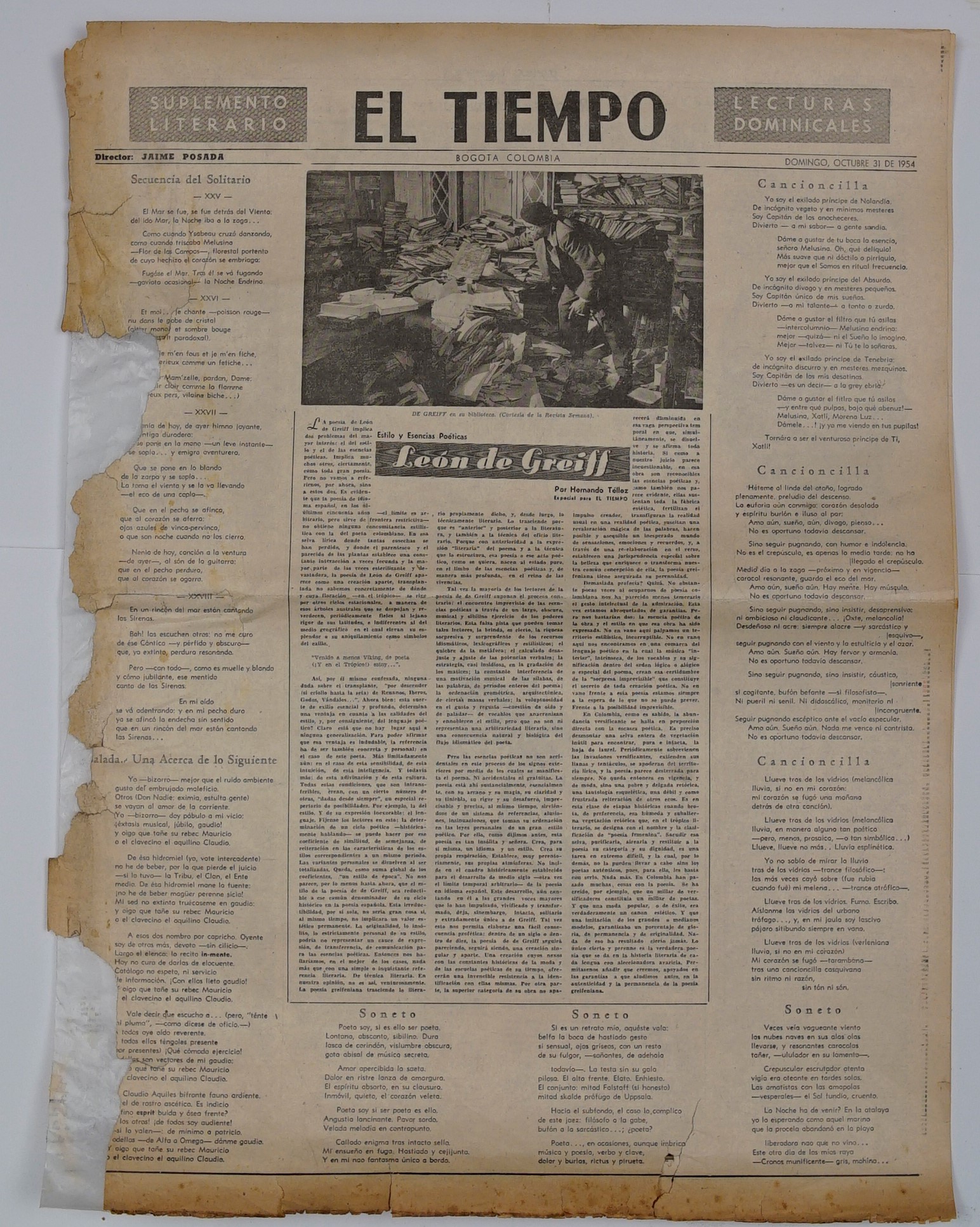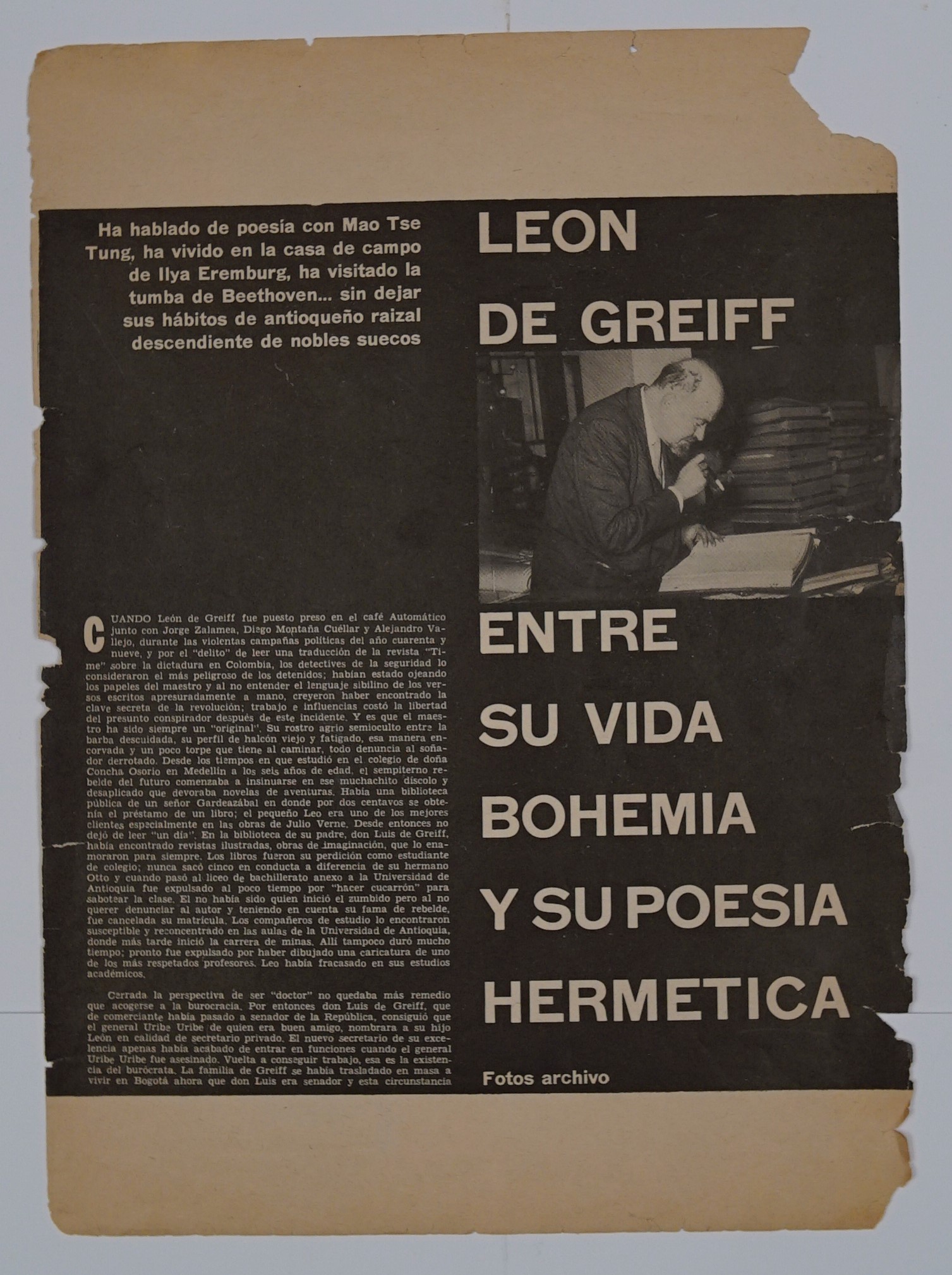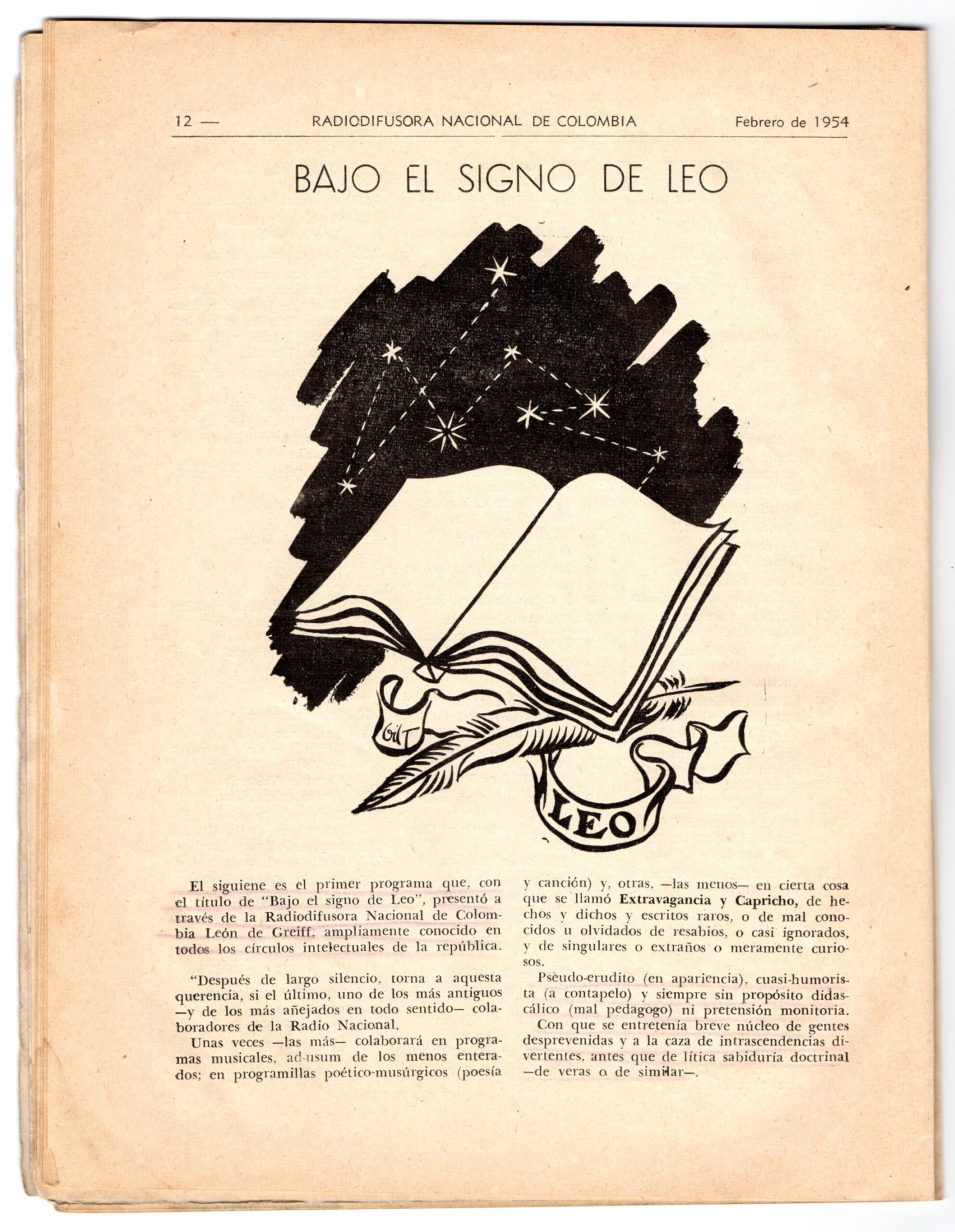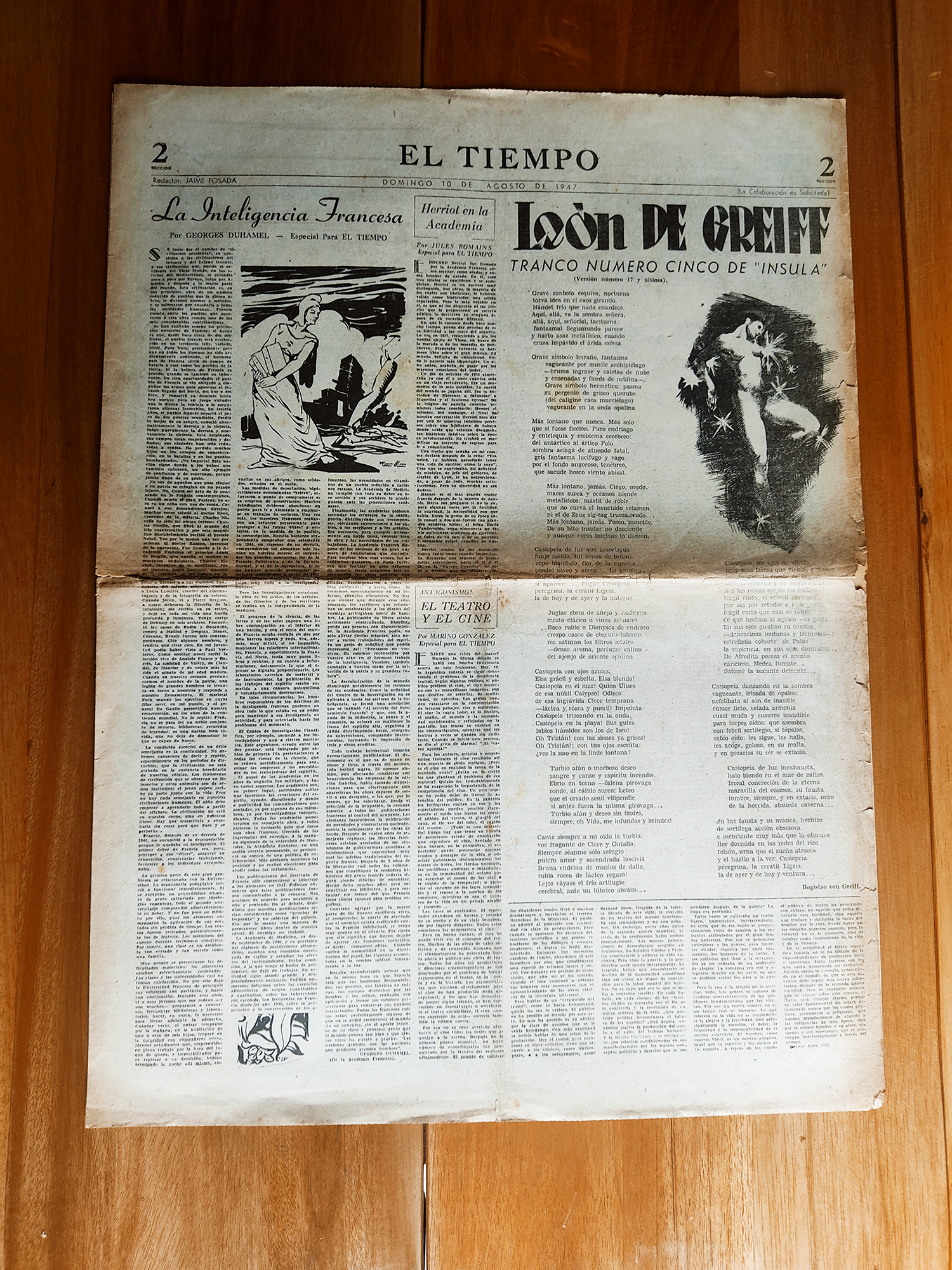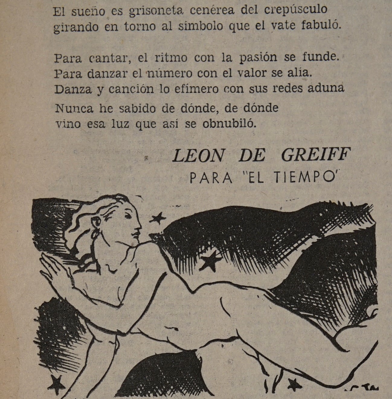 León de Greiff cumple años; estoy en una de sus bibliotecas. Veo a Luis Cabal, a Eduardo y a Jorge Zalamea. Por todas partes hay libros, y discos, hojas de periódico en las que ha publicado, discos, revistas, discos y libros y libros. Es como si aquí se reuniera lo mejor del mundo creado por el arte tipográfico.