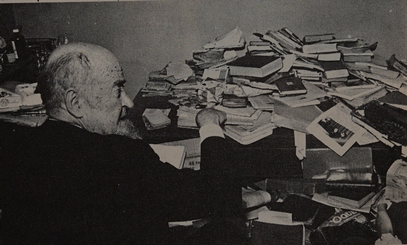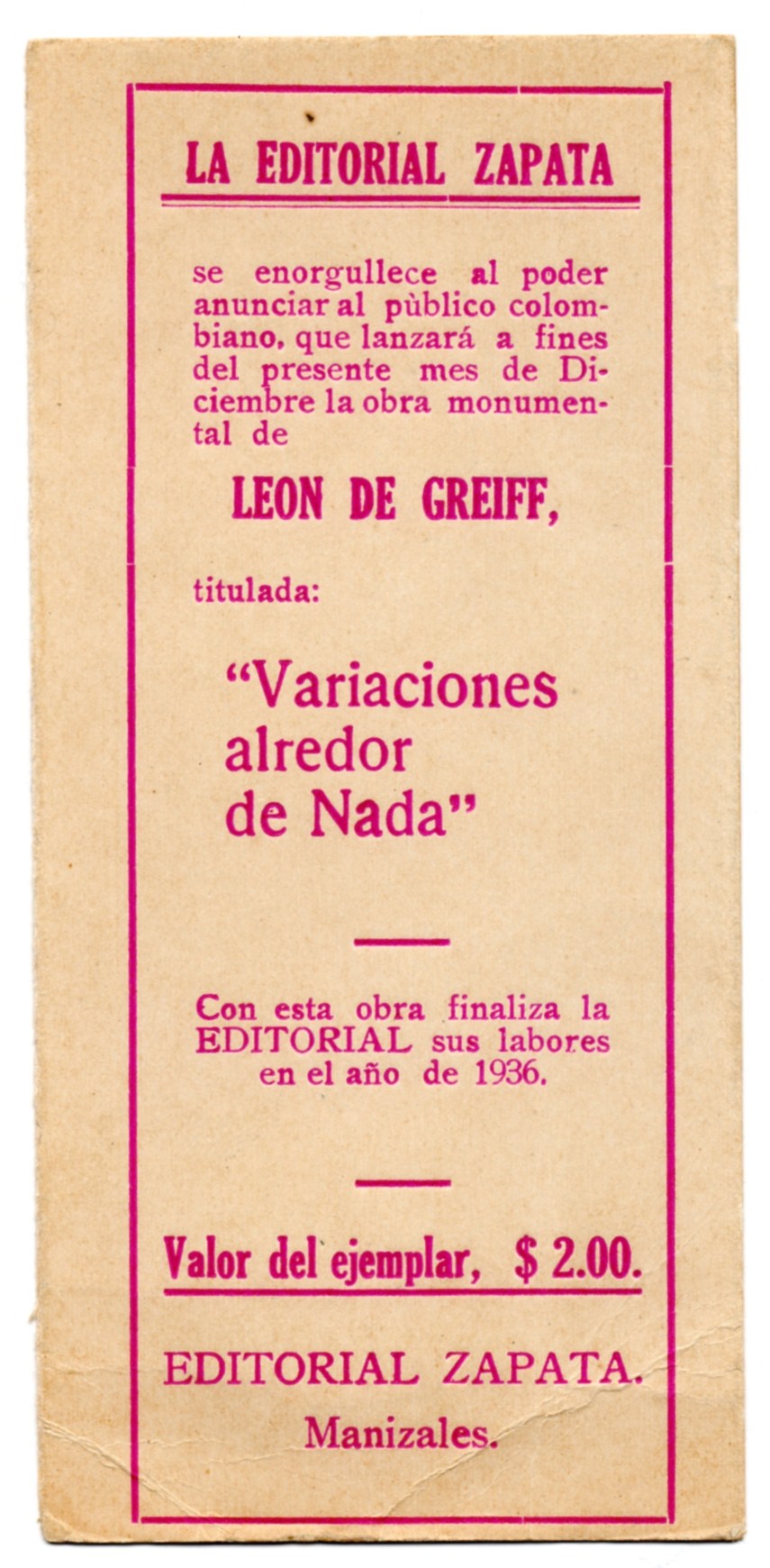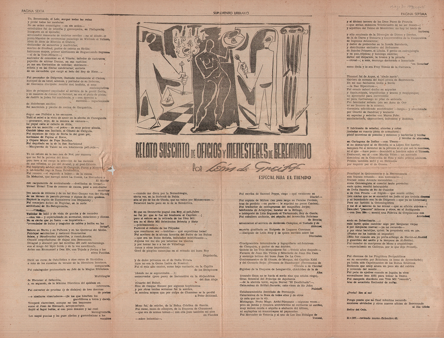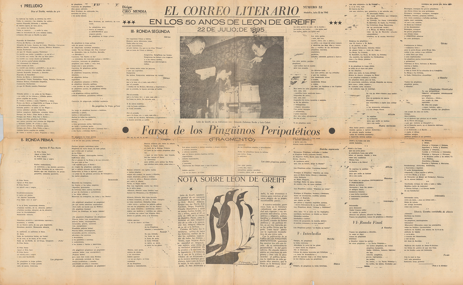 León de Greiff cumple años; estoy en una de sus bibliotecas. Veo a Luis Cabal, a Eduardo y a Jorge Zalamea. Por todas partes hay libros, y discos, hojas de periódico en las que ha publicado, discos, revistas, discos y libros y libros. Es como si aquí se reuniera lo mejor del mundo creado por el arte tipográfico.